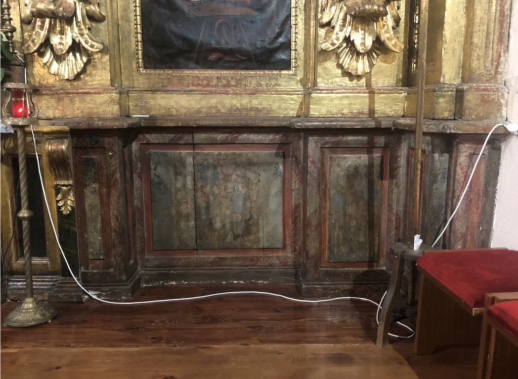 El retablo se asienta directamente sobre un banco de fábrica realizado en madera decorada con motivos vegetales que se encuentra con una gran capa de suciedad ennegreciendo los colores originales.