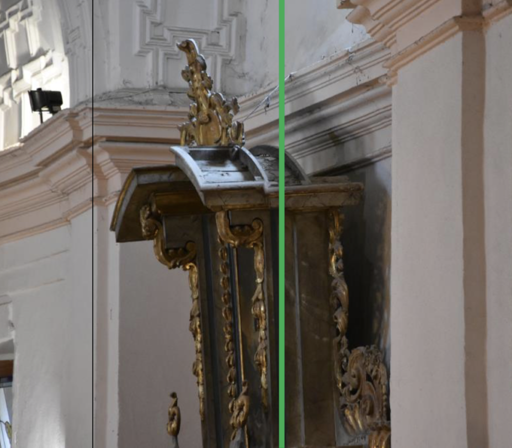 Posteriormente se hará una reintegración volumétrica de todas las faltas que supongan un riesgo para la estabilidad estructural de la obra, así como aquellas que distorsionen la lectura de la misma. Se realizarán las faltas de molduras y piezas de mayor tamaño. El acabado de los volúmenes repuestos se dejará en madera entonada.